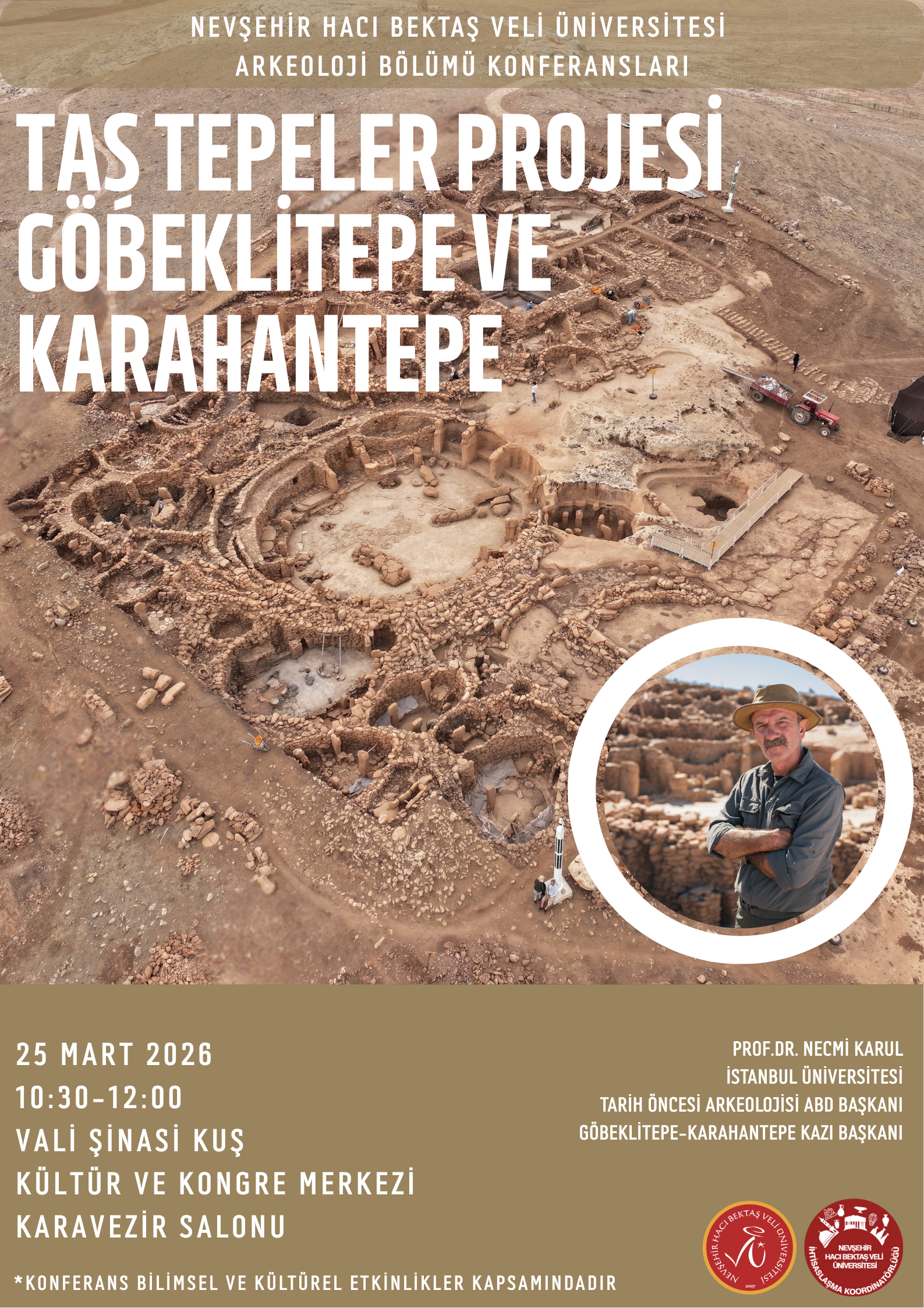 Nevşehir Hacı Bektaş Veli Üniversitesi Arkeoloji Bölümü Konferansları kapsamında, İstanbul Üniversitesi Tarih Öncesi Arkeolojisi Anabilim Dalı Başkanı Prof. Dr. Necmi Karul tarafından, 25.03.2026 Çarşamba günü saat 10:30'da, Vali Şinasi Kuş Kültür ve Kongre Merkezi Karavezir Salonu'nda, "Taş Tepeler Projesi: Göbeklitepe ve Karahantepe" başlıklı konferans düzenlenecektir.